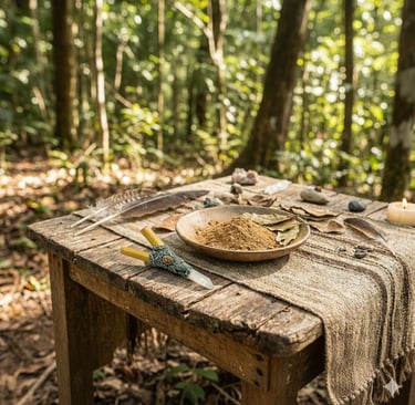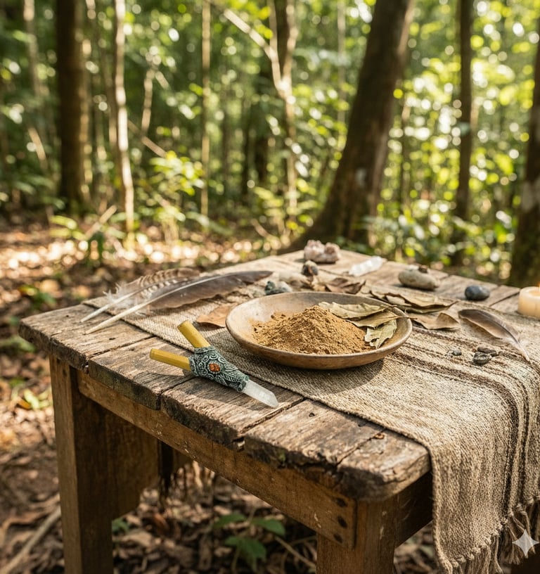 Nesse contexto, o rapé não ocupa o centro do ritual, mas atua como guardião do eixo e da consciência.
