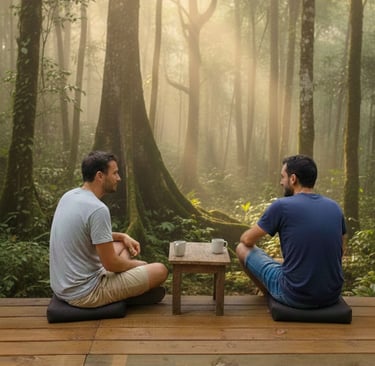 A massagem pode acontecer em diferentes espaços da Casa Cura, seja na casa integrada à floresta ou em contato direto com a natureza, conforme o momento e a necessidade do processo.