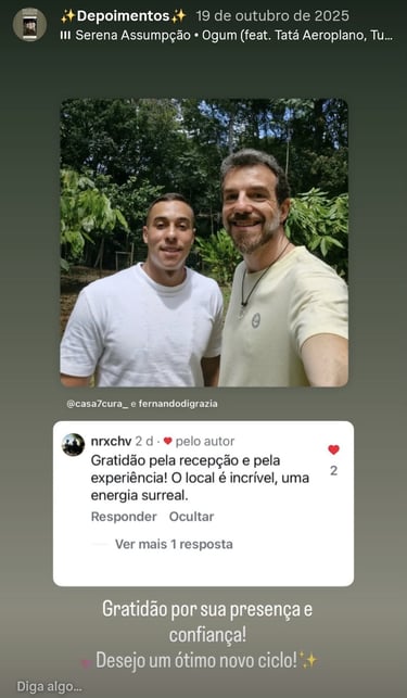 Além dos encontros coletivos, também oferecemos rituais individuais, rituais para casais e pequenos grupos. Essas experiências podem ser agendadas fora dos dias de ritual coletivo, permitindo um cuidado mais personalizado.